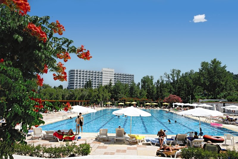 Tischtennis, Beachvolleyball, Gymnastik, Wasserball. Liegen und Schirme am Pool