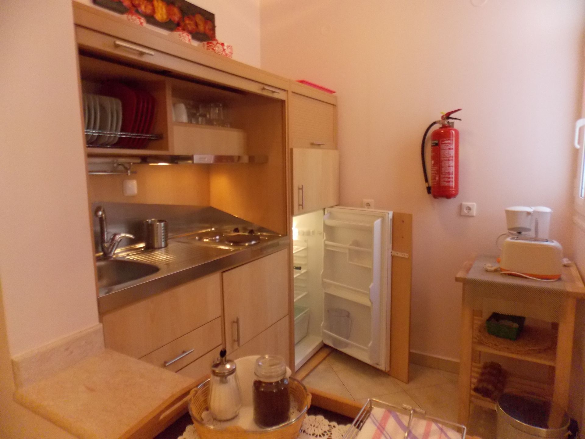 Mineralwasser, Instant- und Filterkaffee, Tee, Milch und Zucker.
