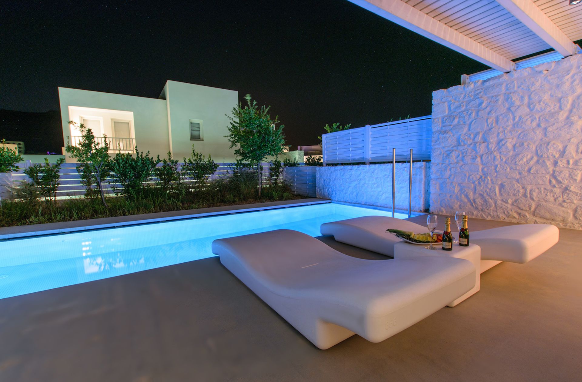kahlen Hügel um Grikos blicken und erkennen, dass Ihnen nichts fehlt. 2 Schlafzimmer Maisonette mit Privatpool bis 6 Personen Die «Maisonettes» sind