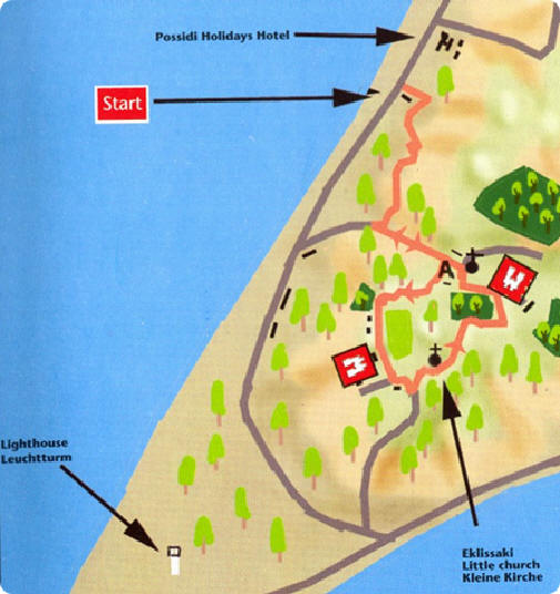 Von hier folgen Sie dem bekannten Weg zurück zum Possidi Holidays Hotel. |
